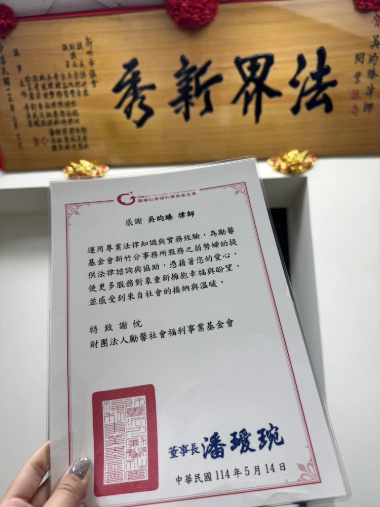 主持律師吳昀臻擁有國立臺灣大學法學碩士學位,並積極參與公共事務與教育推廣,曾擔任新竹縣第二屆青年諮詢委員,現為新竹縣性騷擾防治審議會委員、新竹縣公寓大廈爭議事件調處委員會委員、社團法人新竹律師公會副秘書長,也於新竹市政府、新竹縣市議員服務處、財團法人法律扶助基金會提供公益法律服務。